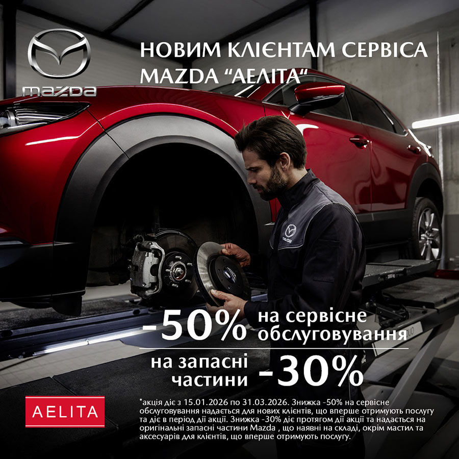 Знижка 50% на сервісні роботи* в автоцентрі Mazda Аеліта та 30% на запчастини** для нових клієнтів Mazda
